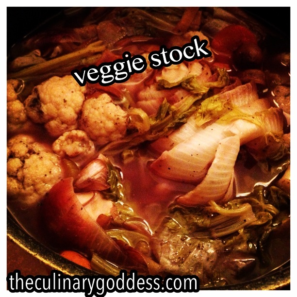 Basically, this is what I do weekly from all the ‘waste” that most people throw in the trash. I save all parts of veggies in a large ziplock baggie, it varies from week to week depending on what I make, but includes the “kitchen sink” of all veggie peels, and ends that you cut off, including garlic skins, ends, peelings, and ends of all veggies. Heres an example of what I had this week. You can chop these things down to make them easier to sautee, (or not)